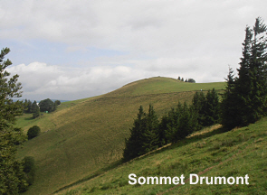 Un peu plus loin le circuit emprunte un sentier, sur la droite, en sous-bois. Il monte régulièrement et traverse plusieurs pistes pour déboucher ensuite dans un pré. Suivre alors la direction du sommet du Drumont (beau point de vue au belvédère).