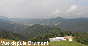 Un peu plus loin le circuit emprunte un sentier, sur la droite, en sous-bois. Il monte régulièrement et traverse plusieurs pistes pour déboucher ensuite dans un pré. Suivre alors la direction du sommet du Drumont (beau point de vue au belvédère).